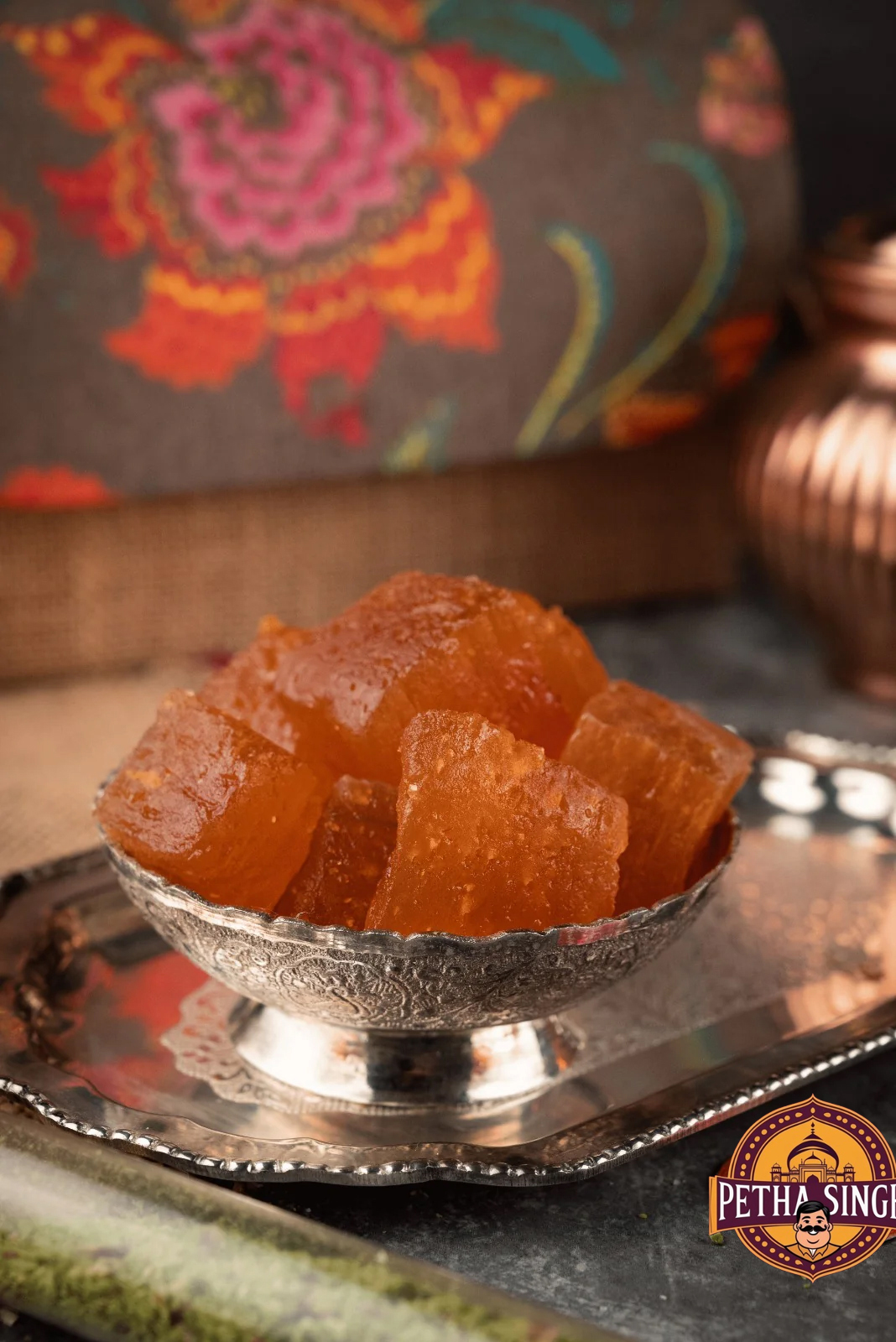 Lal Petha is a vibrant variation of the traditional Agra sweet, characterized by its bright red color and rich, sweet flavor. Made from ash gourd and soaked in flavored sugar syrup, Lal Petha offers a soft, juicy texture with an appealingly colorful twist, making it both tasty and visually striking.