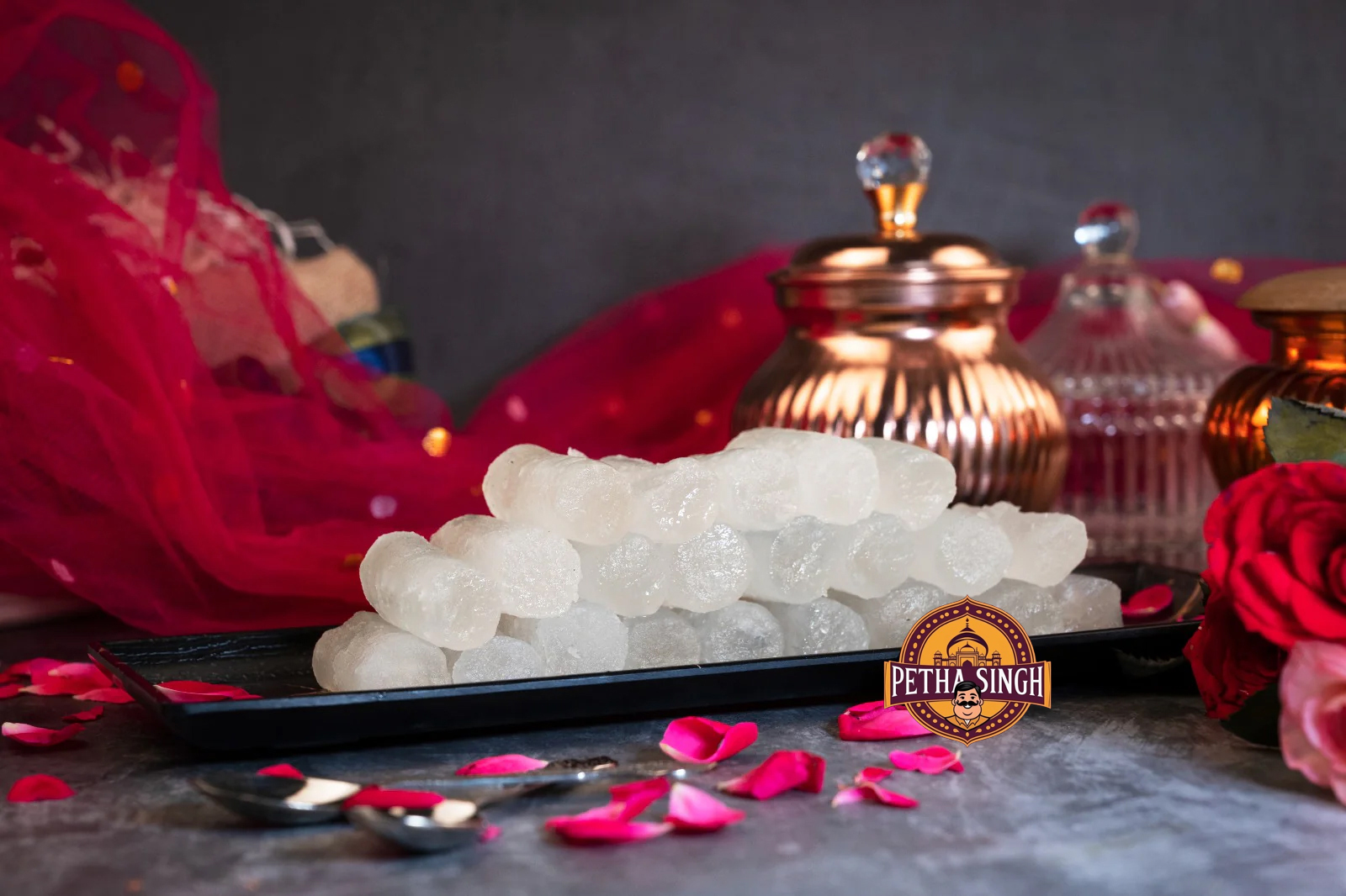 Plain Petha is a traditional sweet from Agra, made from ash gourd (white pumpkin) and cooked in sugar syrup. It has a soft, chewy texture with a mild sweetness, making it a classic and refreshing treat.